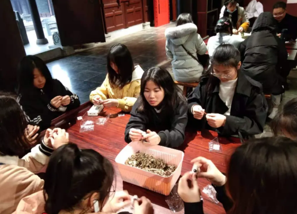 坐在非遗大讲堂,学生们全神贯注地倾听老师讲授屈原生平、端午习俗、湖湘文化,进一步了解屈原精神和非物质文化遗产的历史内涵!在研学老师的亲自带动下缝制了自己的专属香包。